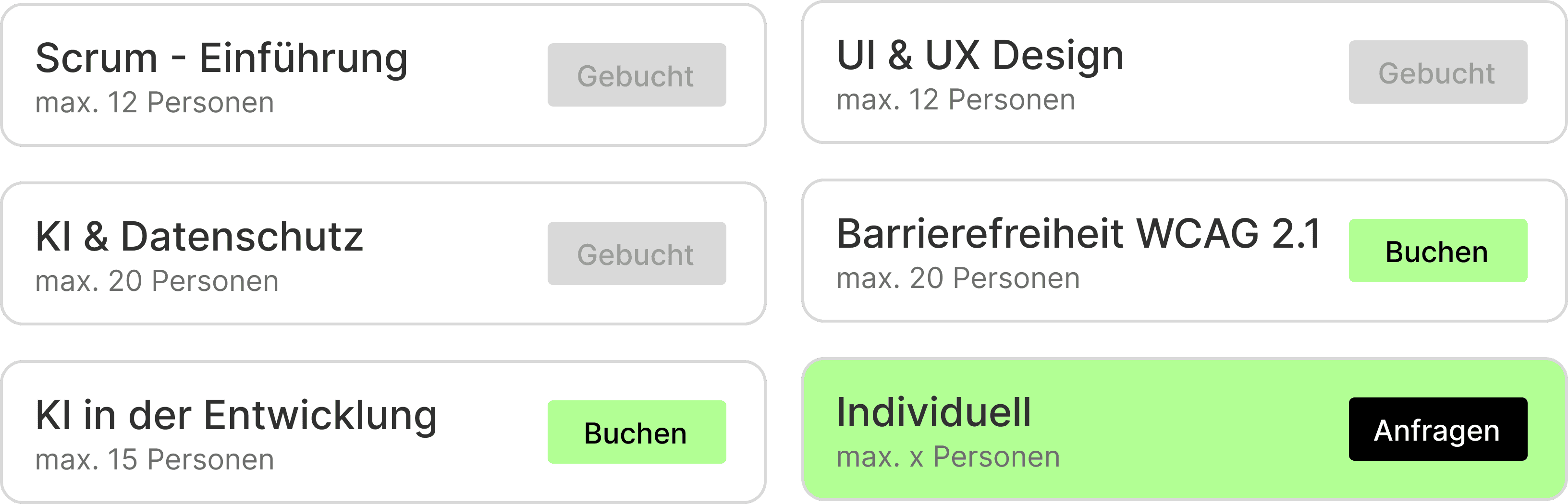 Practice-oriented sessions on agile working, UX methods, AI strategies, and technology deep-dives – tailored to your needs.